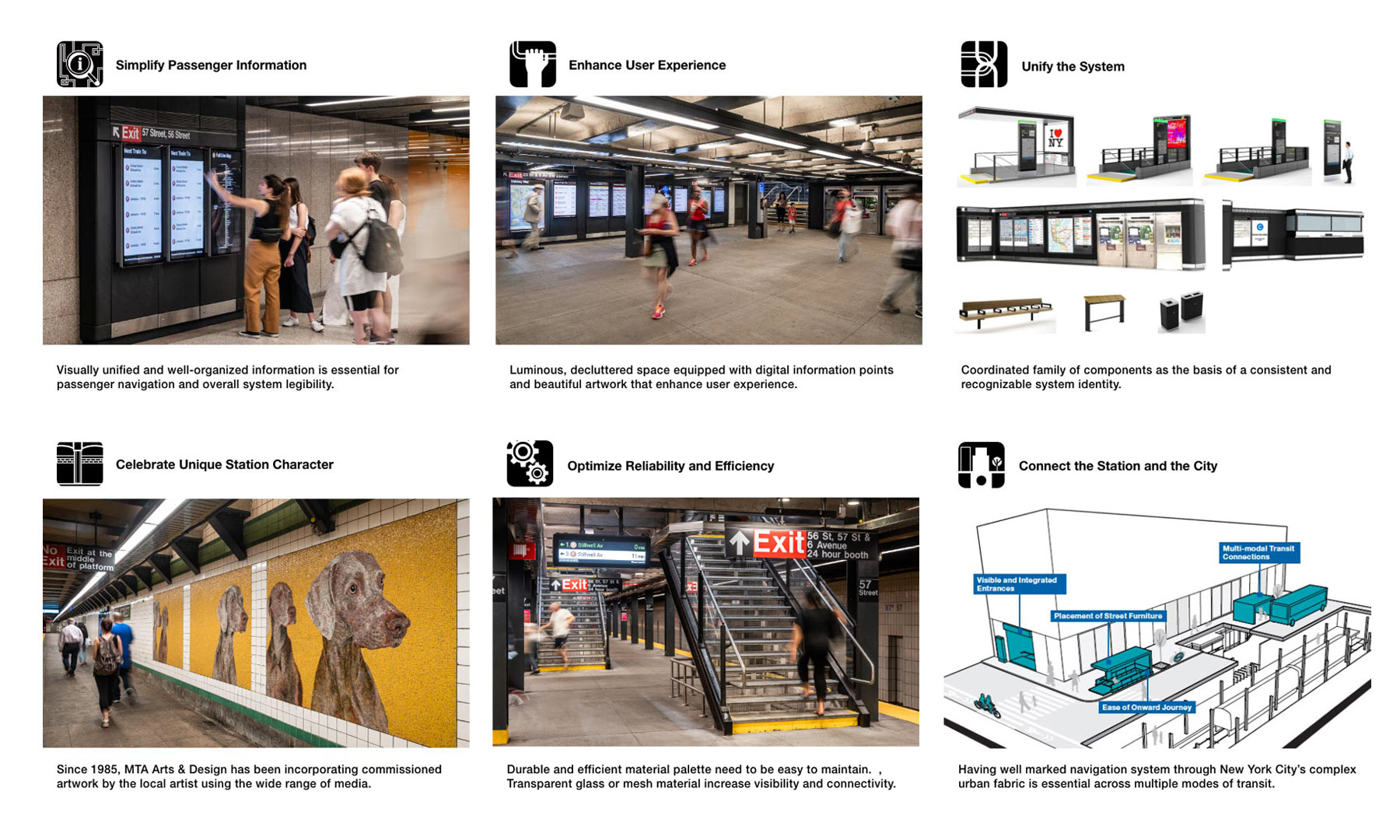 Our design ethos is to AMPLIFY the existing aesthetic and historical value is the central goal of this series of renovation projects. The additions need to CLARIFY the critical information by decluttering the space. The design needs to BALANCE between preservation and modernization in order to maintain the system-wide identity. Unique art installations and user centered design experience shall provide passengers a journey with a DELIGHT.