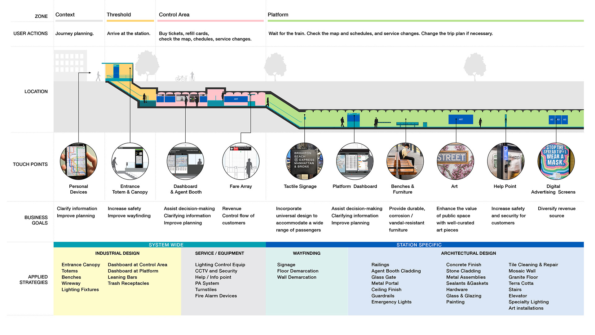 With over 1.7 billion riders per year, the NYC subway passengers are diverse in their age, physical ability and familiarity with the subway. It is crucial to understand and accommodate these users' needs – their cultural diversity, and journey patterns to guide through the design process. It is also important not to overlook the needs of the employees and maintenance crews who spend a longer period of time underground.