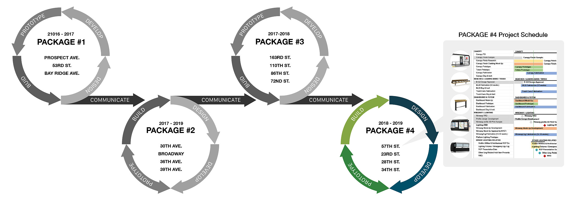 ESI Program consisted smaller "packages" which rolled-out in staggered schedules. Each package went through a rigorous design, review and implementation process to ensure the consistency in aesthetic quality and functionality. The changes were integrated into following packages and each station's project schedule.