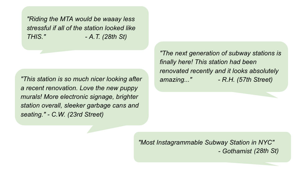 The project was received positively by the users in general, and the average review of these stations are rated higher than before. Some criticisms were drawn to the project scope of work, which did not include accessibility strategies such as installations of elevators: however, such major overhauls are currently underway in the separate capital projects across the system. There were other ongoing issues such as vandalism of art and equipment, but the brightness and newly installed security cameras keep these stations safe and less vulnerable.