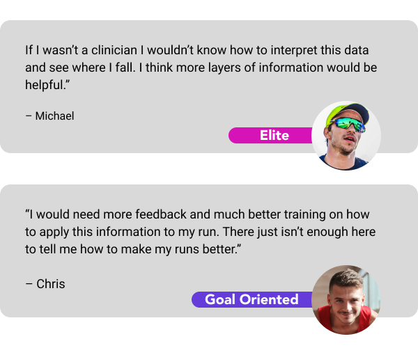 Goal Oriented and Elite users were more enthusiastic about the potential of this app. But even those who have knowledge of each metrics through PT and coaches thought it would be better if the app can illustrate what to focus and how.