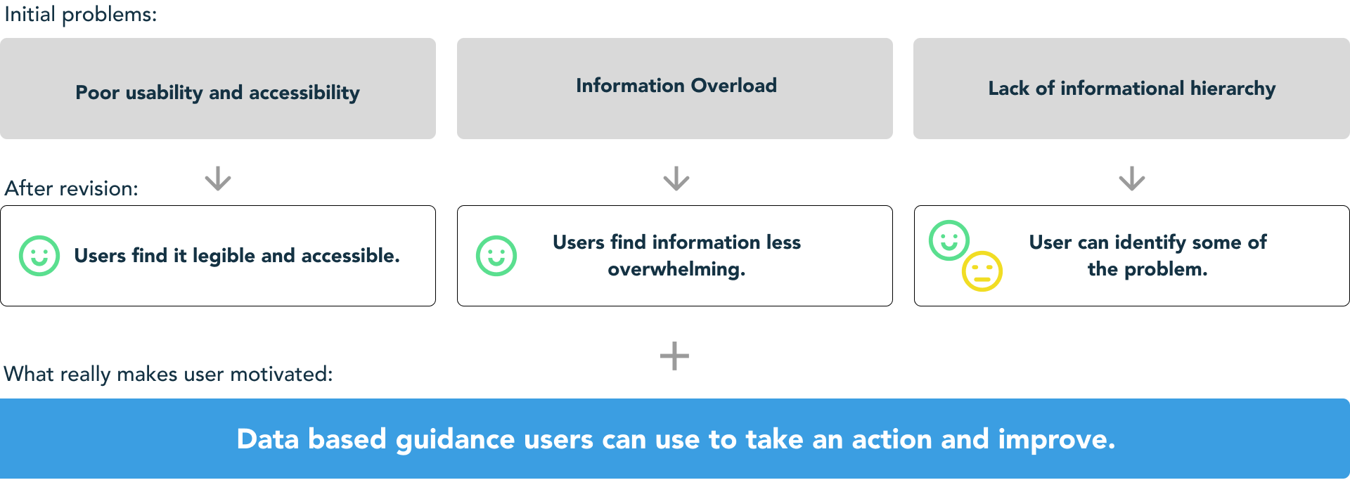 The existing design was showing various metrics in similar looking graphs all at once, seemed overwhelming.