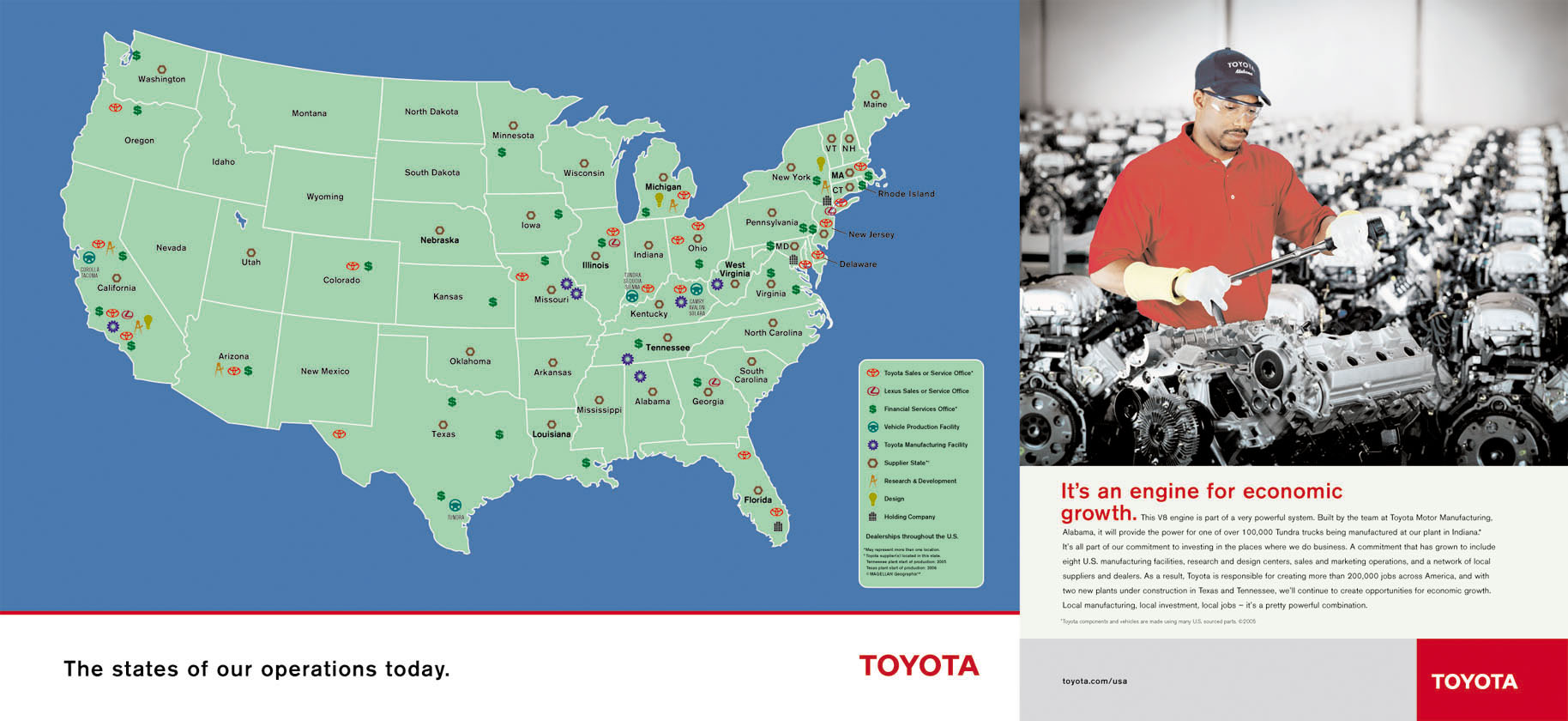 Toyota began operation in the United States back in 1957. And since then their total investment has grown over $12 billion dollars, with more than 31,000 employees in the U.S, generating $ 2.1 billion dollars of an annual U.S. payroll. Dentsu has been creating periodical campaigns to advertise Toyota's commitment to the U.S. Each campaign involves numerous publications containing pictures and diagrams of factories and their locations. My role was to revise Flash animations, prepare materials, create layouts, and finalize the publication.