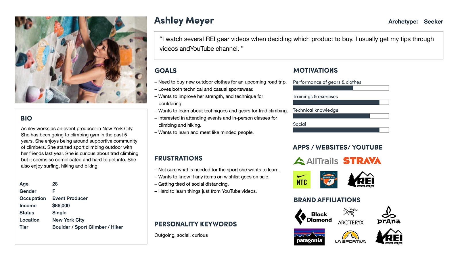 From the survey I have narrowed down to two types of user personas. Ashley, the architype “Seeker”, represents the group of young indivusuals just getting into the sports and may have strong social motivations. There’s an opportunity to nurture her brand loyalty through introducing new gears and clothings though teaching how the products are supposed to be used.
