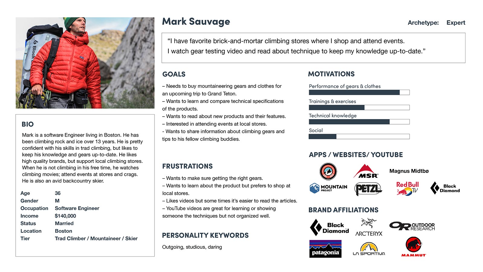 Mark, the architype “Expert”, may already have a set of gears and clothings; however, he is very keen on keeping up with new technologies and products. He shares those information he found with others including Seekers. Seekers may find Experts as source of information and mentorship. As such, both types of personas are integral to the brand growth.