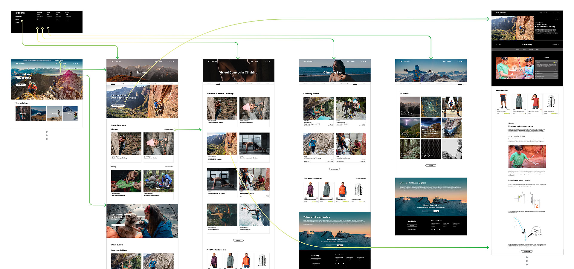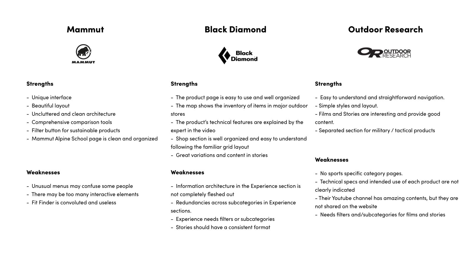For competitive analysis, three competior’s websites were chosen: Mammut, Black Diamond and Outdoor Research. All three have different approaches in how to merge education and experience components into their businesses. The most tangible one is Black Diamond, however it somewhat lacks the organization and comprehensiveness.