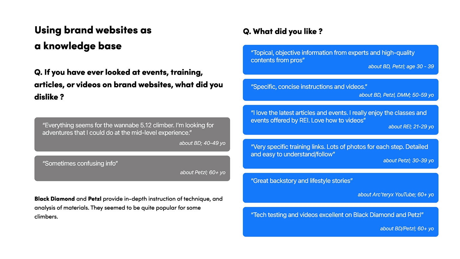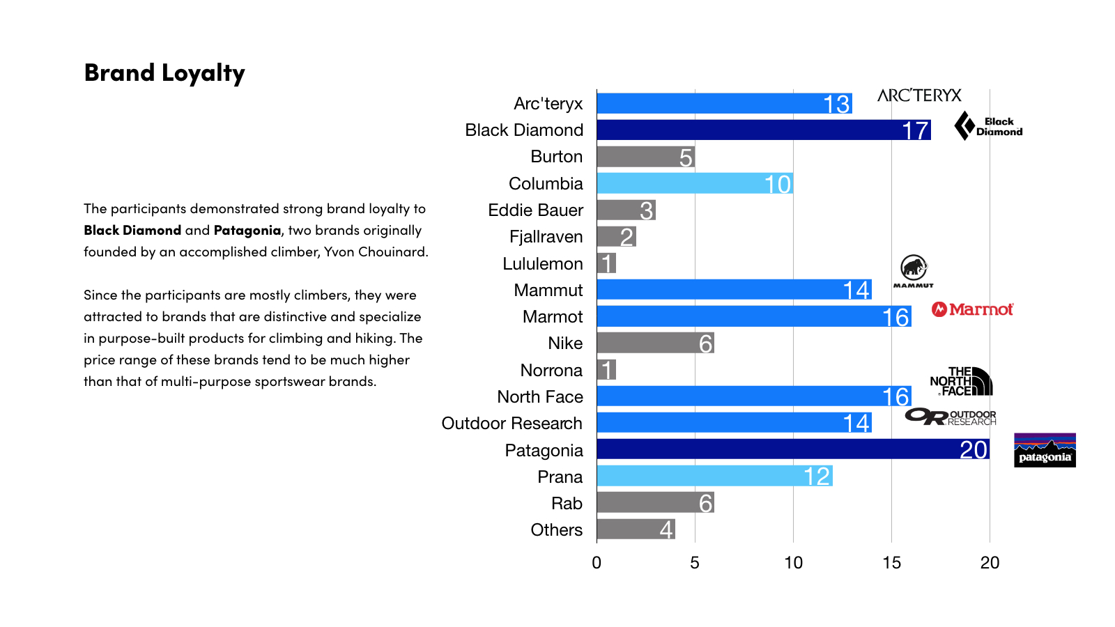 The participants demonstrated strong brand loyalty to Black Diamond Black Diamond and Patagonia, two brands originally founded by an accomplished climber, Yvon Chouinard.