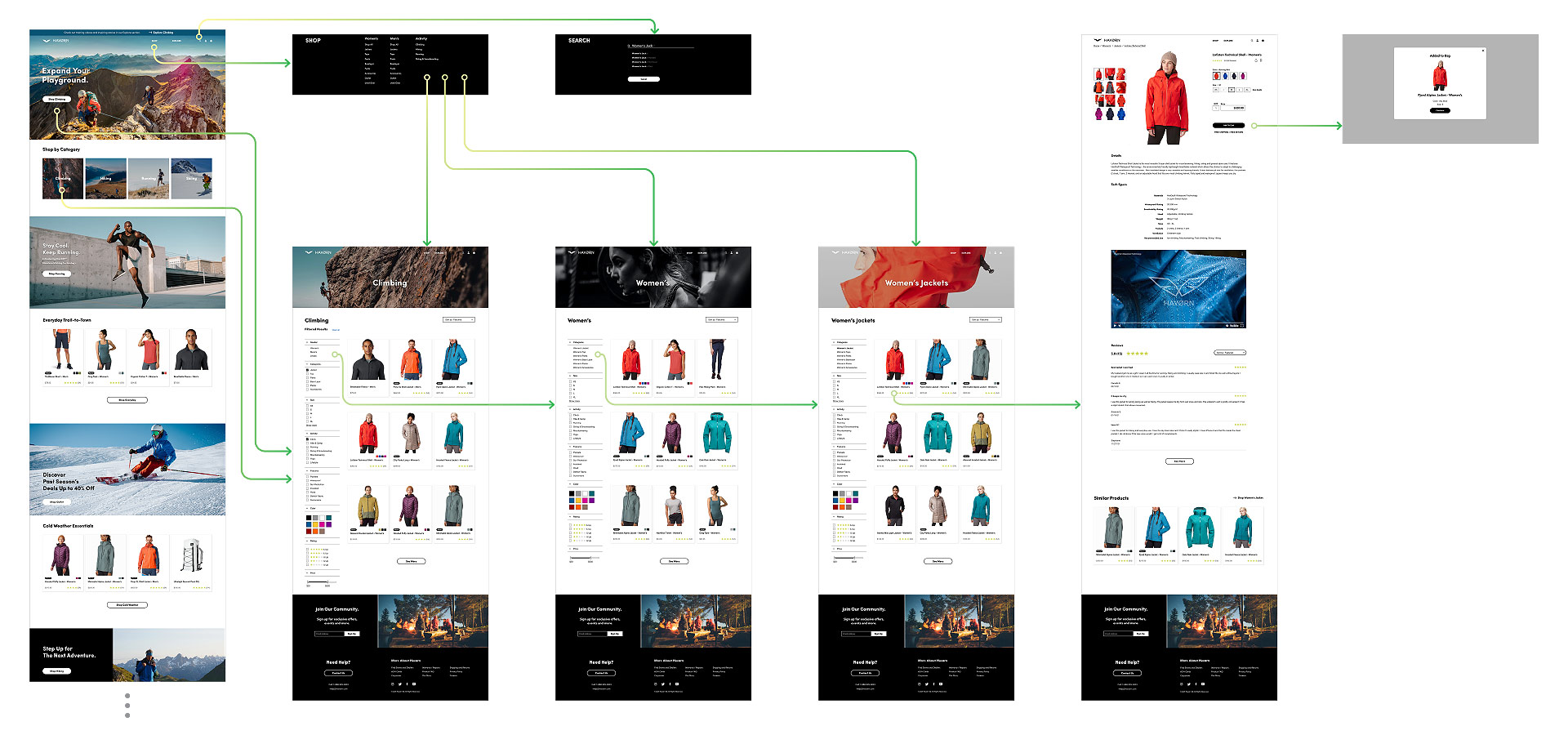 Shop section follow the standard e-commerce structure. Home page is a collection of featured products, promotions and the product cards with featured items. The mega menu allows user to navigate to the sections catogorized by sexes and type of sports.